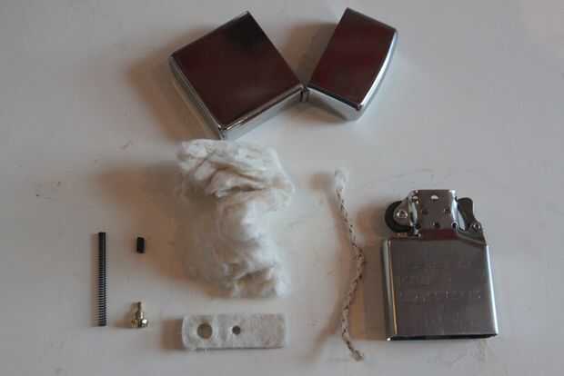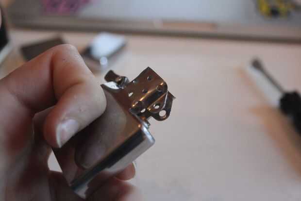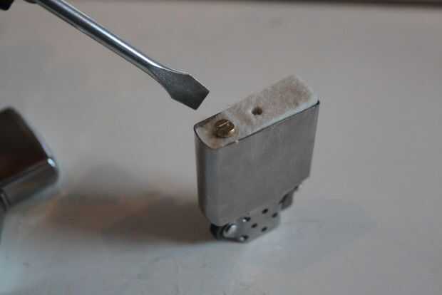 Tomar el cuerpo del encendedor de la carcasa y voltear el cuerpo. En la parte inferior, desenrosque el tornillo que tiene abajo el pequeño pedazo de fieltro en la parte inferior. Retire una vez destornillado el entero dentro de contenido del cuerpo. Disponer de la primavera, pedernal y mecha. Todas las otras partes se requerirán para el proyecto.