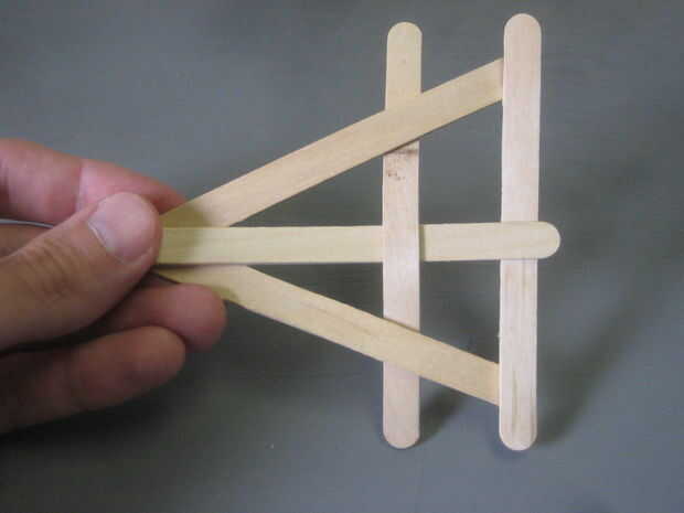 Tomar el palo 5 º y último y cuña entre los tres palos aventados. Tienes que mantener la presión del sujetador en los palillos aventados, quieren desarmarse. Necesita el palo 5 º por debajo el palo central y encima de los palos de izquierda y derecho de la cuña. O enfrente de lo que acaba atrapada el palo 4.