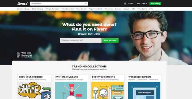 Fiverr es un sitio web donde los usuarios pueden comprar o vender servicios en línea tales como diseño gráfico, Diseño Web, edición de vídeo, voz overs, etc, ideal para 5 dólares.