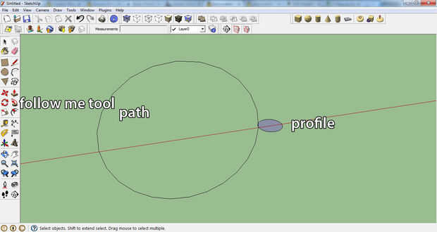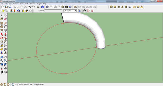 pongo esta en porque me he dado cuenta frustra a la gente, todo lo que necesitas es un rostro (perfil) y una libración de la línea (ruta) sobre el perfil y dará vuelta a puntos como cuando con la herramienta "push pull", tire de la cara y coloque el cursor en la línea, debe a rojo y puede seguir hasta el final, utilizar el borrador para suavizar la línea y listo