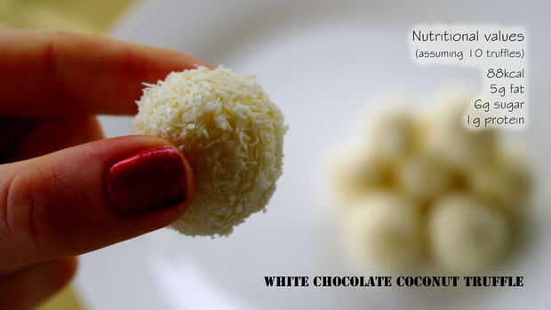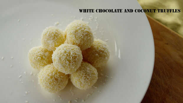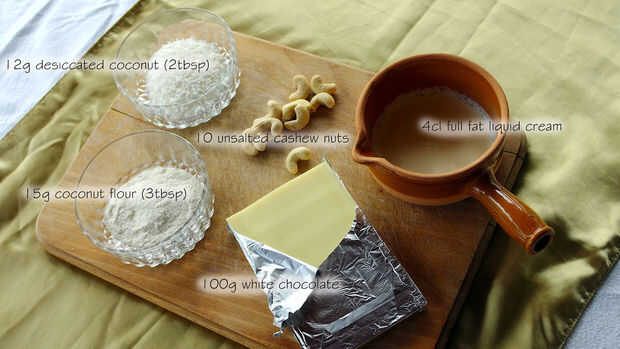 1. una vez más, picar el chocolate en trozos, poner la nata a hervir y verter sobre el chocolate para fundirlo. Mezclar hasta que se forme una mezcla homogénea y luego mezclar la harina de coco completamente.