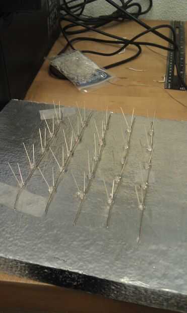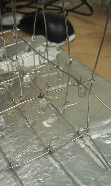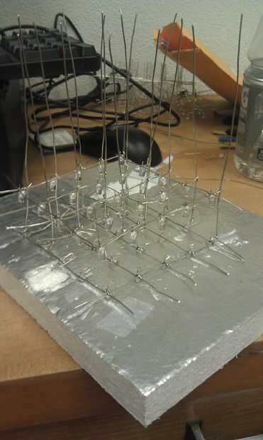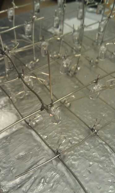 El siguiente paso en la construcción del cubo es incluso más complicado. Es necesario conectar los ánodos de los LEDs en 25 columnas verticales sin dejar que cualquiera de ellos (o su cable de conexión) toquen los planos del cátodo. Hice esto fue dejando el plano superior de la espuma de poliestireno y colocar cables ~ 6 pulgadas al lado de los ánodos. He utilizado alicates de punta delgada para los ánodos se encrespan en bucles por lo que era más fácil de soldar. Alternan la direccionalidad de los cables de los aviones de cátodo para la estabilidad. Ver las fotos.