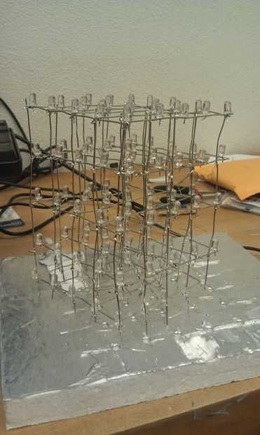 Empecé montando las 5 capas o planos del cubo. Esto implicó conectar juntos todos los cátodos de los LEDs. ID hizo esto sobresaliendo 25 LEDs (cerca de 1 pulgada de distancia) en un trozo de espuma de poliestireno. He doblado todos los ánodos de y soldar los LEDs en 5 columnas y luego dos filas en el extremo (ver foto). Tenga cuidado al soldar porque el cable entero se calienta mucho y accidentalmente quemé yo mismo varias veces al tocar el extremo de uno de los cables.