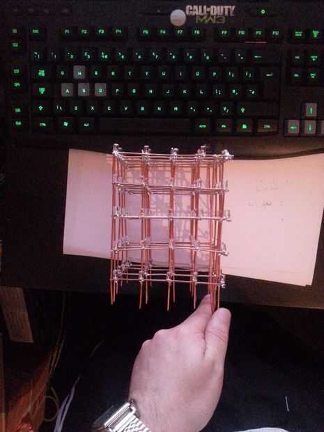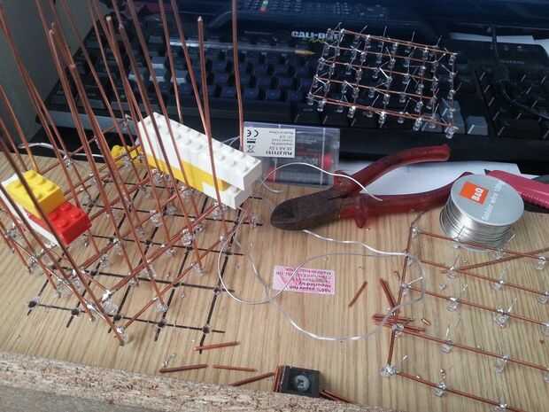 Me empezó hacer una plantilla de trazado y taladrar agujeros en una pieza de madera y colocar los LEDs en los agujeros... Luego soldar el 25 LED para las barras de cobre 7. (que hice de usar el alambre de cobre de dentro algunos cable eléctrico doble y de la tierra que tenía en mi caseta...)