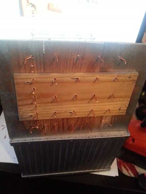 I taladrar agujeros en la tapa y montar las patas del cubo a través de ellos... las patas de 4 esquina estuvieron dobladas un poco para sostener el cubo en su lugar.