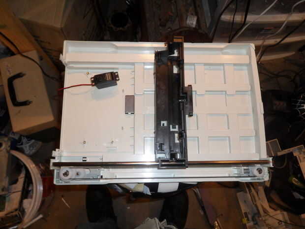 Como se puede ver aquí, he quitado el motor paso a paso, pero he dejado intacta, la correa tiene que tener algo para montar en, así como se puede ver aquí, tengo un escáner vacío, y tengo todo juntos de nuevo la caja de engranajes, por lo que el carrage de escáner se mueve a lo largo de la cama como él pretendía hacer.
