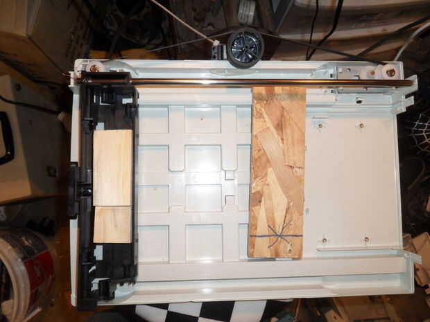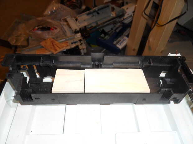 Como se puede ver aquí, usted necesitará algunos pequeños bloques de madera para rellenar el espacio vacío en la parte inferior del carrage, pegamento estas abajo con la pistola encoladora.
