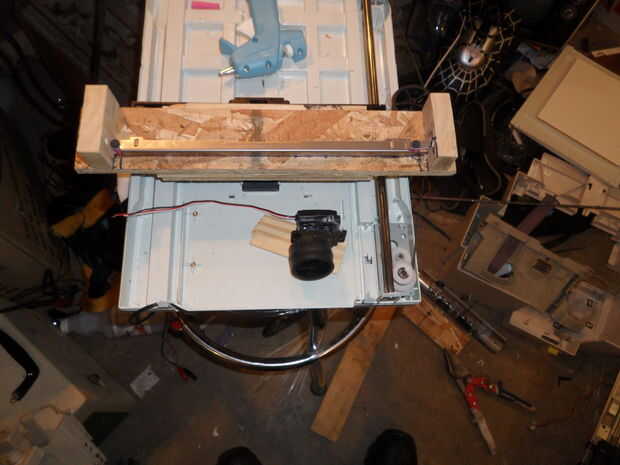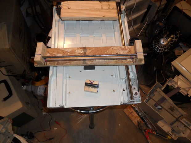 Ahora necesitas hacer tu carro, como he dicho que he utilizado un trozo de la misma madera de que hice mi cuadras finales, tuyo puede variar de la mina, según la plataforma y el escáner, pero mina fue 3/4 de espesor, 2 pulgadas ancho y 2 y 3/4 pulgadas de alto, aquí también, he usado la carcasa de un marcador de crayola , como mi guía, coloque sobre mi barra de guía, esparce un poco más que me hubiera gustado, pero resultó no debe ser un problema. Me senté en mi bloque de carro, hasta en la plataforma contra la guía inferior y guía superior y luego ponga una marca en la parte posterior de mi bloque de carro eran el tubo guía sería ir (levanté mi 1/4 de pulgada de la madera de la parte inferior, para que no solo en la madera contrachapada) entonces marcó la parte de atrás estuviera quería mi tubo guía para colocarse. Aseguró mina, con un montón de hotglue jejeje, tiene muy bien, no han tenido un problema con él todavía.