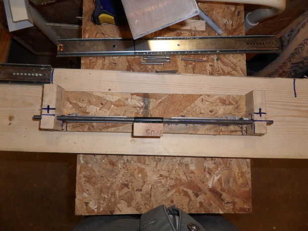 Ahora, usted tendrá que cortar la varilla de guía de metal, sólo necesita tiempo suficiente para que se entra en los agujeros y va hacia el exterior de ambos bloques de madera, se puede ver en mi foto, el mío es de una media pulgada más de largo, en ambos lados, pero no tiene que ser, pongo algunos hotglue alrededor de ambos extremos de la mina.