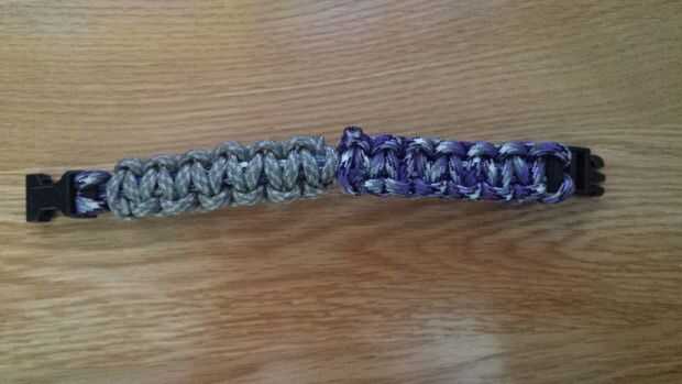 pulseras Paracord hacerlo con un Flatline o trazador (Flatline es un filamento de Paracord con la cadena de centro sacado y trenzado en la parte superior de un brazalete de Paracord y un trazador es un pedazo de micro paracord trenzado a lo largo de