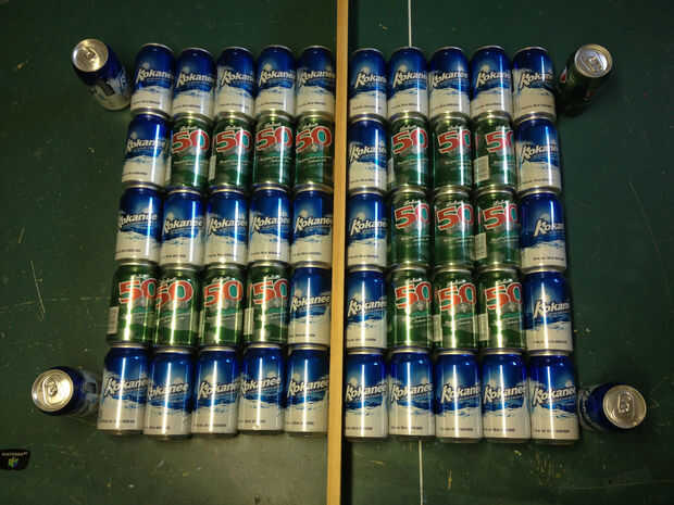 Con este arreglo firmemente establecido pude medir las dimensiones mínimas necesarias para la pieza de apoyo, permitiendo que un poco ligera de espaciado horizontal entre ellos para acomodar los lazos zip que se cierre las latas en la parte posterior.
