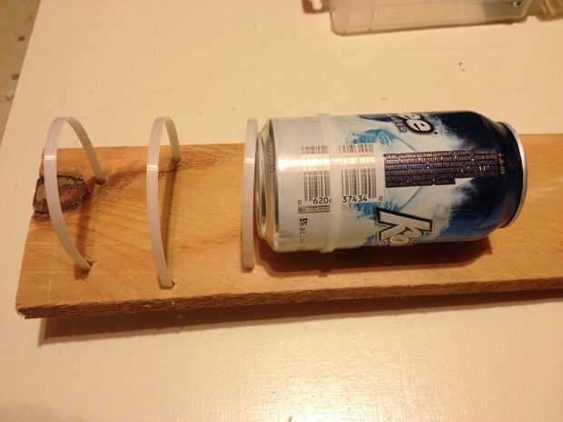 La forma más estable para sujetar las latas en posición mientras sigue permitiendo el fácil acceso era tienen dos agujeros detrás de cada una para una atadura envolver. Experimenté con diferentes espaciamientos de 1/2" a 2 1/2" antes de determinar que 1" fue el tamaño óptimo para dar un ajuste ajuste permitiendo el contacto entre la can y el respaldo. También confirmó que cuando levanta a vertical el puede no solo cae derecho. Hubo algún juego inevitable pero puesto que las tapas y fondos del dispositivo de seguridad una base simple para la parte inferior puede sería suficiente para mantener estable la pila entera.