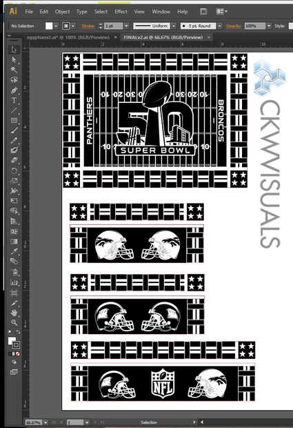 Cuando se trata de hacer estos tipos de pechos su realmente todo sobre el diseño. Este diseño para el Superbowl fue desarrollado mediante el uso de Photoshop e Illustrator. Usé Photoshop para ser capaz de tomar imágenes de los cascos y el nuevo logo de Superbowl aniversario 50 y convertirlos en vectores fácilmente legibles para illustrator.