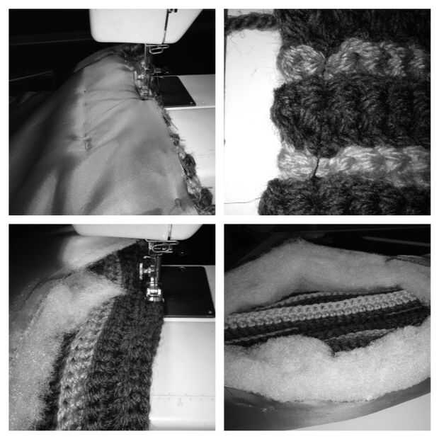 Para el interior cortar una pieza extra de forro mide 6 pulgadas de ancho por 4 pulgadas de largo, usé las tijeras dentadas para cortar alrededor de los bordes y luego de la mano del bolsillo cosido esta pieza en la orejera. Hice esto último porque quería asegurarse de que fue colocada correctamente en el interior.
