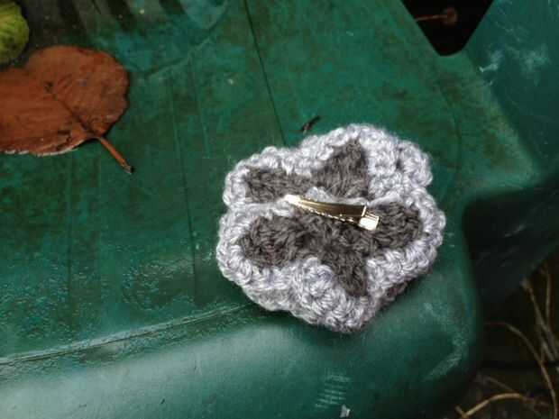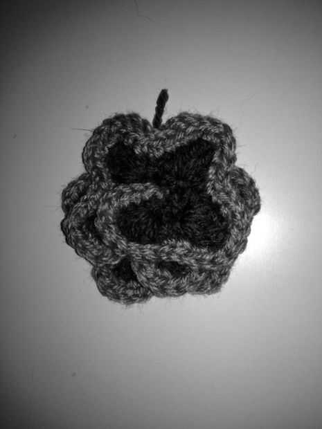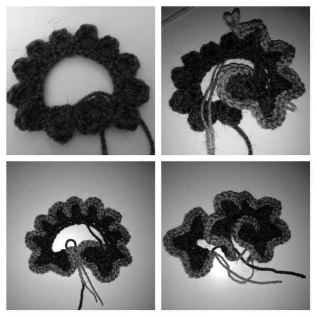 Fila 3 - (este es donde he añadido el hilo gris más claro) Sc en cada punto (al llegar al centro de cada pétalo, a ambos lados de la puntada del tr de la hilera anterior). Añadir sc tres a cada lado y repetir en la cima de cada pétalo.