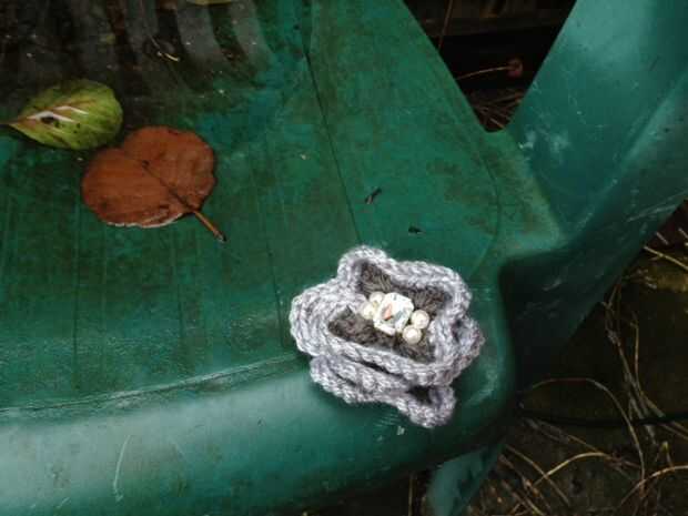 La foto ilustra torcer juntos para crear la forma de la flor. En la parte delantera de la mano cosió algunos adornos para la decoración y en la parte posterior os adjunto una pequeña pinza (o puede utilizar cualquier clip de pelo) utilizando una pistola de pegamento, reforzada con hilo invisible cosido a mano para añadir a la sensación vintage.
