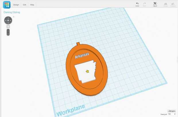 He añadido el mapa de cada Estado como una capa en GIMP, lleno en el esquema, poniendo atención a las islas, etc. y dejó una marca para indicar que el Capitolio. Puede ver los restos de la estrella de 50states en la anterior imagen de Arkansas. Para el siguiente paso, necesitaba un relleno sólido dentro de la imagen, con una marca lo suficientemente grande para ser reflejada en el archivo svg pero lo suficientemente pequeño para ser llenados y cubiertos por la estrella que terminaría creando en Tinkercad. De GIMP, genera 50 pngs, cambiar el estado que era visible y el contenido de la capa de texto entre cada uno.
