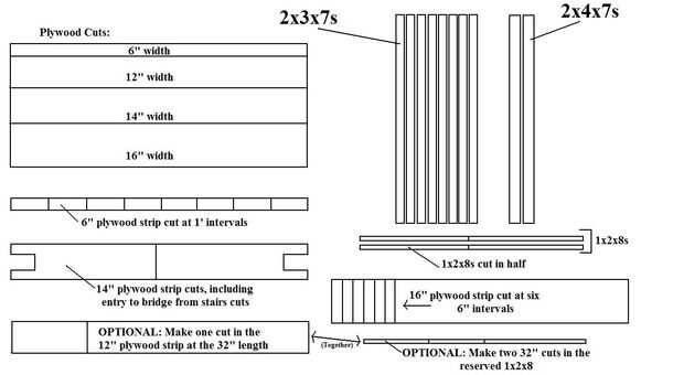 4. Corte la tira de 14" de ancho (x 8') por la mitad para hacer dos 4' largo x 14" piezas anchas. Estos serán sus puentes por encima de sus estructuras. En un extremo de cada 4'x 14" pieza, cortar una aproximadamente 5-6" ancho x 7-9" agujero largo con su juego. Estos serán los puntos de entrada a los puentes de las escaleras. Consejo: Si es difícil conseguir un rincón agradable, limpio de 90 grados, perfore previamente agujeros en las esquinas con una 1" espada broca para hacer un lugar para su rompecabezas maniobrar a través de limpio.