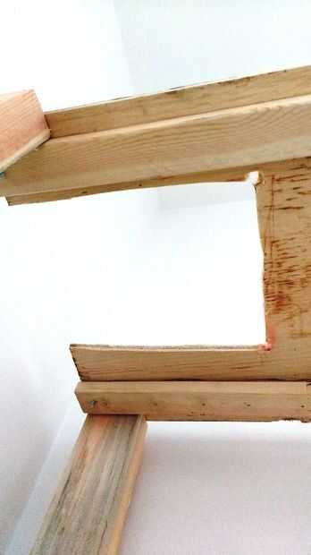1. seguir los pasos de la estructura primero. Coloque dos 2x3s y un paso entre ellos para determinar el grosor necesitan de ajuste. Poner en el segundo paso donde crees que debería ir. Extienda su otras dos 2x3s de esta estructura a su lado y hacer lo mismo con la instalación en los pasos, pero les Coloque para que vayan entre las posiciones de los primeros los pasos (véase el cuadro para mejor explicación). Consejo: Para mi Marcos escalera exterior, tuve los pasos más altos entonces los marcos escalera interior para que cuando el gato alcanza la parte superior de las escaleras, ella podría saltar a través del agujero precortado en el puente y acceder al punto más alto de la estructura de esta manera.