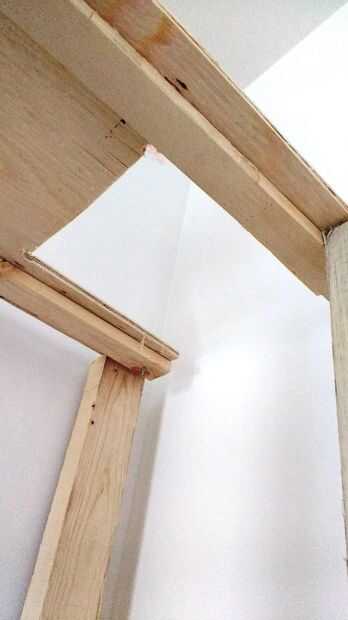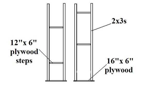 3. fijar las bases de madera contrachapada (de 6" largo x ancho madera cortes de 16") a los fondos de estos marcos de dos escaleras (como se ve en la imagen) usando tornillos o largo de uñas (1-1.5").