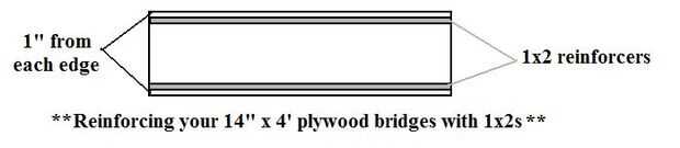5. reforzar el corte de 4'x 14" madera contrachapada puente piezas con el 1x2x4s que ir con ellos (2 por pieza de puente). Ya que las escaleras están separando los bastidores de escalera de 12", llegará en sólo 1" de los lados. Lugar su 1x2x4s aquí (a lo largo de 4' de la Junta). Ver la imagen de un visual.