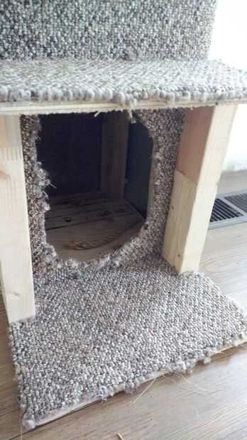 6. para hacer el pequeño paso (como yo lo hice para acceder al condominio superior), simplemente usar dos de tus piezas de 1 pie que te cortan el 2x3s y dos piezas de madera pequeña en la parte superior e inferior de la madera. Estos pedazos deben tener un 6" x 12" profundo gran pedazo de madera contrachapada para la parte superior (podría utilizar el paso no utiliza en la estructura de un si usted complementado para la perca alargada en lugar de otro) y un 8-9" profunda x 12" gran pedazo de madera contrachapada para la base (es un poco más para que no vuelque cuando kitty salta en la parte superior). Uñas en primer lugar, la base de las patas de 2 x 3 pero mantener el piernas a la vuelta las esquinas de la madera contrachapada. Esta vuelta y clavo en la parte superior de las patas de 2 x 3, asegurándose de alinear las piernas en las dos esquinas mismo que fue la primera pieza de madera contrachapada en (por lo que, a diferencia de cuando hiciste los pasos con proyección a ambos lados, esto ahora estará al ras contra el condominio de kitty). ** Asegúrese de que cuando son accesorios en el paso final que usted esta alfombra, too.* * caliente pegar la madera del respaldo (básicamente cualquier lugar sentado al ras contra el condominio) a la alfombra de "pared" en la parte delantera el condominio para darle un refuerzo resistente desgaste ilimitado. Hecho.
