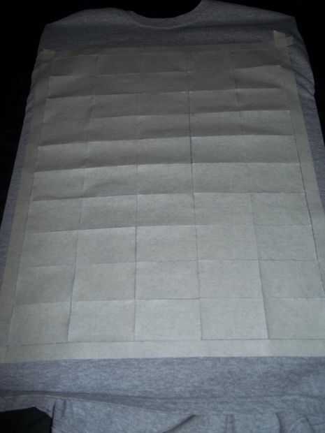 Pone tus piezas de cinta hacia fuera en cualquier patrón que se desea, con los bordes de las piezas a tocar a sus vecinos (sin espacios). Para la camisa de este gran hombre, 5 columnas de 10 era ideal.