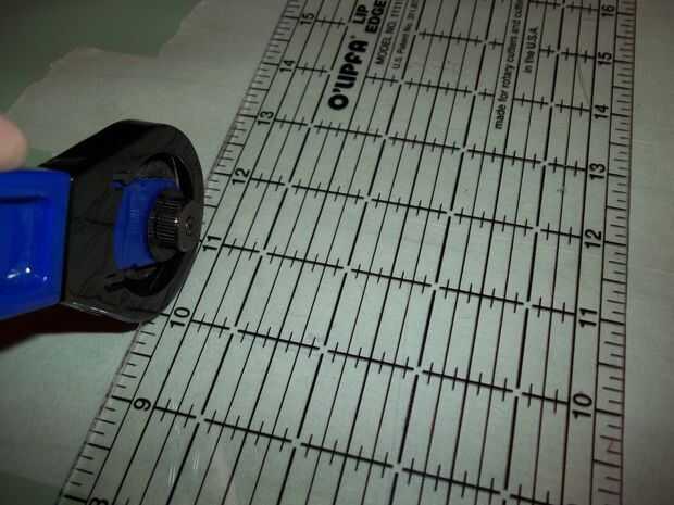 Cortar la cinta ancha haciendo 50 longitudes relativamente iguales. Lo hice poniendo la cinta en tiras sobre una estera de corte y después usando un disco de corte de papel y regla de acrílico de la rejilla. Para la camisa de un hombre grande, corté 2" amplia cinta en tiras de 3". Realmente llenó la parte delantera de la camisa bien. Para las camisas más pequeños, nos estrecha la cinta y cortar en trozos más pequeños.