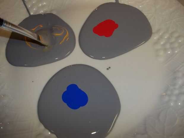 Cada envase de pintura se dividen en tres porciones en platos de plástico individuales.
