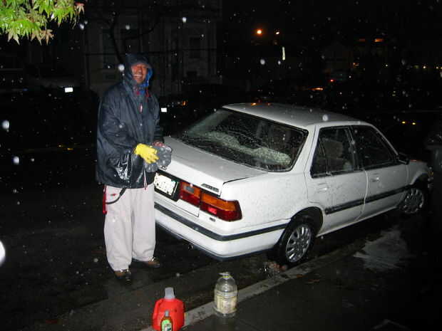 Así que con un viejo teeshirt, algún champú y algún detergente, fue a trabajar y frotó su coche bajo la lluvia. Buena idea Juan Garcia!