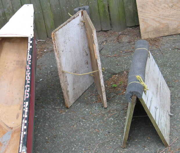 Cortar dos trozos rectangulares de madera, algunas perforaciones y atarlos juntos como esta. Los trozos de aislamiento de la pipa del cojín la parte superior para este uso como el barco está parado. No es que mis barcos sufriría de ninguna manera visible de contacto con la madera contrachapada.