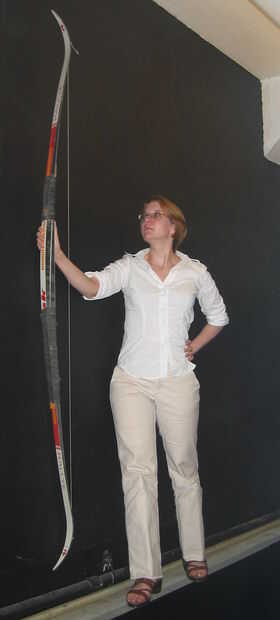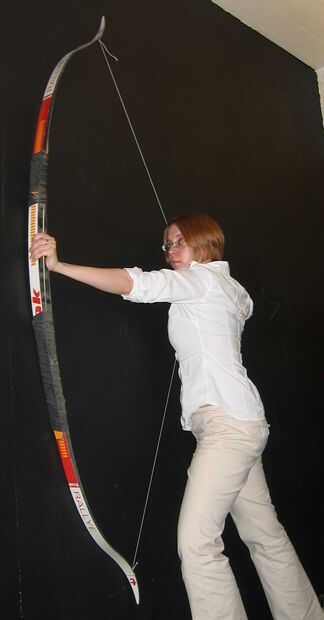 Atacó a un par de esquíes de fondo esquíes junto con una cámara de bicicleta y ató lazos en una línea de kitesurf para una cuerda de arco y había entregado a él. Le gustaba por lo tanto lo utilizó en su clase de tiro con arco.