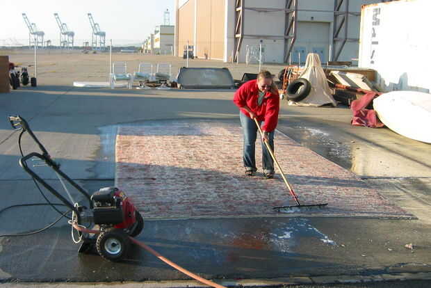Primero rociaron detergente por todas partes, entonces presión había lavado con el pulverizador. Ahora ella es jalador-ing el agua jabonosa de la alfombra. Hay una leve inclinación en el estacionamiento por lo que el agua drene hacia fuera. Luego la alfombra drenada y secada al sol durante un día o dos. Ella apuntalado para conseguir más flujo de aire alrededor de él.