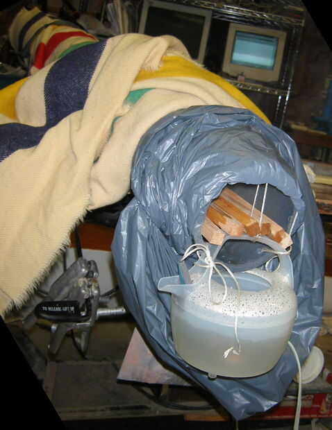 Colgué un hervidor de agua eléctrico de la parte delantera. He atado y había cubierto una bolsa de basura sobre el frente para que el vapor se subió en el tubo. Le enchufamos el otro extremo de la tubería y cubiertos mantas sobre ella para el aislamiento.
