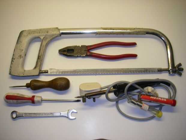 Sierra, punzón, soldador, llave inglesa o alicates.
