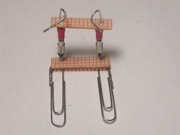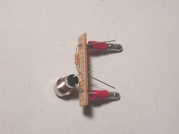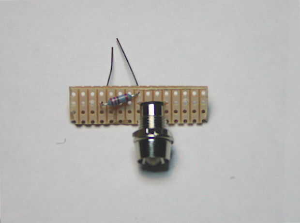 Soldar piezas de chatarra de clip (o cable de conexión) en varones extremos de conectores. Colocar en los extremos femeninos en la base; Deslice el otro trozo de placa perforada en los conectores machos, luego de la soldadura en su lugar. Agregar a la resistencia y el LED como descrito arriba, asegurándose de que la resistencia y el LED están en las mismas pistas como los conectores negativos y posiitve. La soldadura de componentes en su lugar.