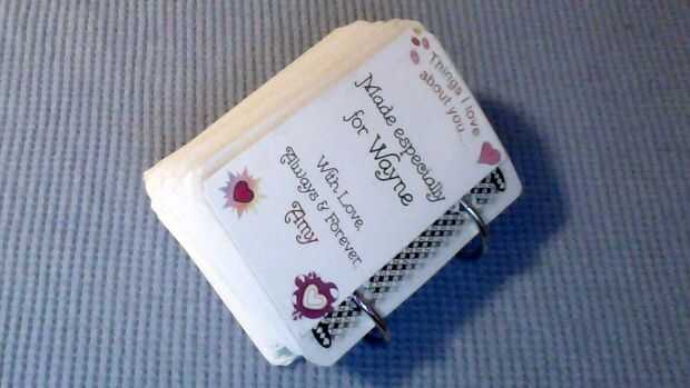 Después de perforar todos los agujeros, abrir el libro anillos, poner las cartas (en el orden que hayas elegido) en el libro anillos y cerrar hacia arriba. Si tienes anillos pequeños como el mío, que tenga que hacer la mitad cubierta por un lado y la mitad en el otro de modo que usted puede cerrar los anillos correctamente. Si no tienes libro anillos, puede cuerda por los agujeros de la cinta y atarla, pero no apriete demasiado; dejarlo lo suficientemente holgado en la "columna vertebral" que todavía puede pasar las páginas. Asegúrese de que las tarjetas de todos están orientados hacia la dirección correcta en relación con cada uno otro. También asegúrese de que ninguna de las páginas se pegan.