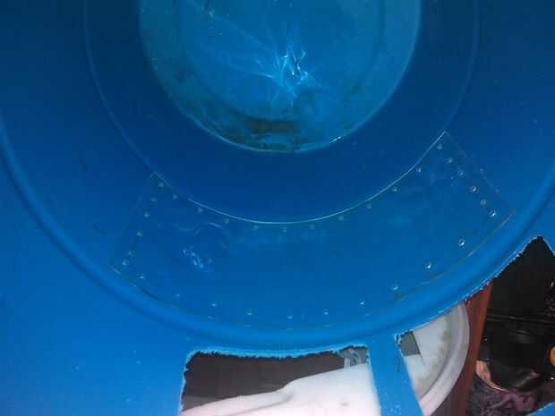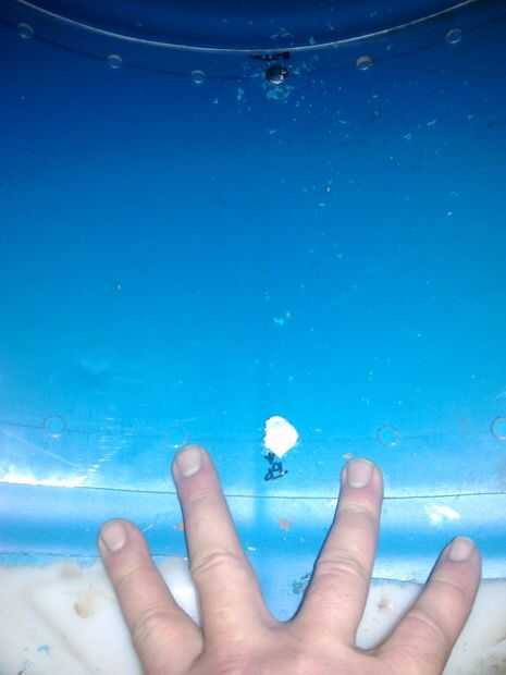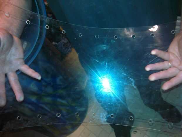 Una vez que tengas tu 11" por 20" pedazo de plexi, marcar los agujeros de perno con el rotulador. Sugieren ir 2" aparte, dejo un búfer de 1" entre el borde del vidrio y los agujeros de perno. Para perforar los agujeros, usé un taladro de 3/8 bits. Asegúrese de ejecutar a su taladro hacia atrás y se aplican muy poco a ninguna presión para evitar fisurar el plexiglás. Una vez que se perfora el plexi, elimine las rebabas alrededor de los agujeros, establece una cacerola de la pizza en el horno boca abajo, precalentar el horno a 250° lugar el plexiglás perforado sobre la bandeja y calentar durante 5 a 6 minutos. Comenzará a hundirse un poco en este momento y ser lo suficientemente suave como para formar. Usando guantes de algodón, retire del horno, el plexiglás y coloque en el cilindro, (Asegúrese de que el vidrio y el barril son limpias) y manténgalo dentro del barril para un par de minutos para asegurarse de que forma a la curva del tubo. Déjelo allí por unos 10 minutos que se enfríe completamente antes de agarrar el taladro nuevo. Ahora es tiempo para perforar el cañón. Usando los plexglass como plantilla, taladre los agujeros mediados en la parte superior e inferior de la ventana, inserte un perno desde el interior del cañón a la salida y agregue una arandela y una tuerca. A continuación, perfore los agujeros a cada lado de este medio perno, (superior e inferior para un total de 4 agujeros) y añadir las arandelas de los pernos y tuercas a estos. Siga usando este método desde el medios hacia fuera e insertar los pernos de perforación mientras avanzas hasta llegar al borde de la ventana. Los orificios laterales se pueden todos perforar uno tras otro a ambos lados y luego se pueden insertar los tornillos.