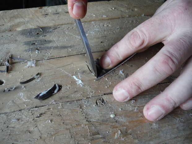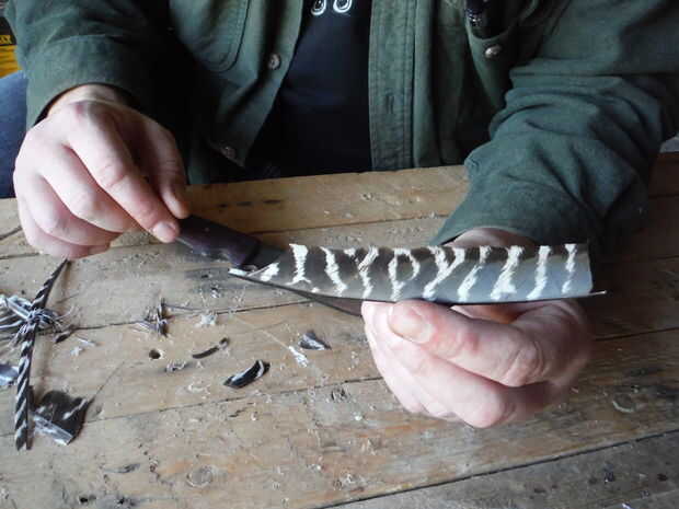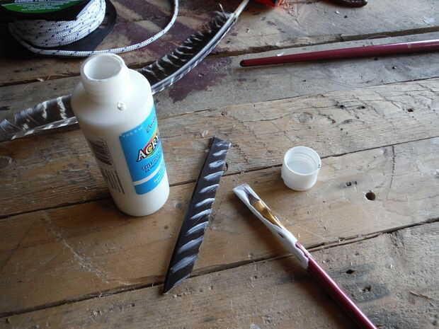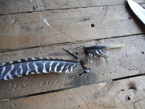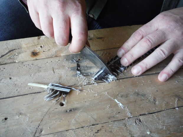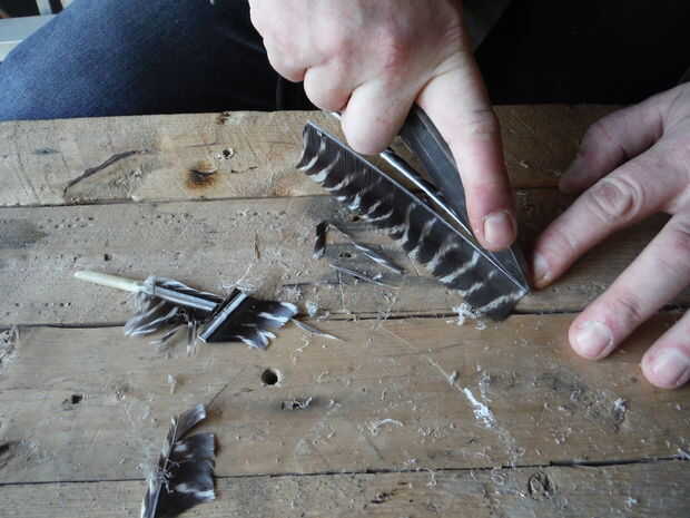 A continuación necesita dar forma tus remeras, pero primero debe identificar qué camino tienen que montarse. Las barbas del ángulo de pluma en una dirección hacia la punta de la pluma y de la vaina. Se trata de cómo se montará en el eje, con fletch hacia el nock de la flecha. Es importante que montarlos así como les remeras hacia atrás podrían causar vuelo incorrecto e interferencia con el arco.