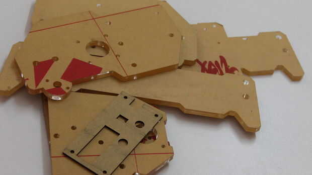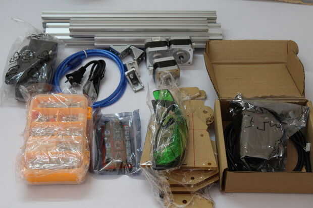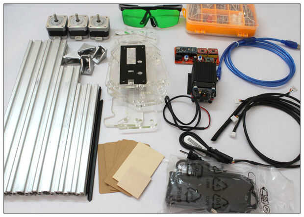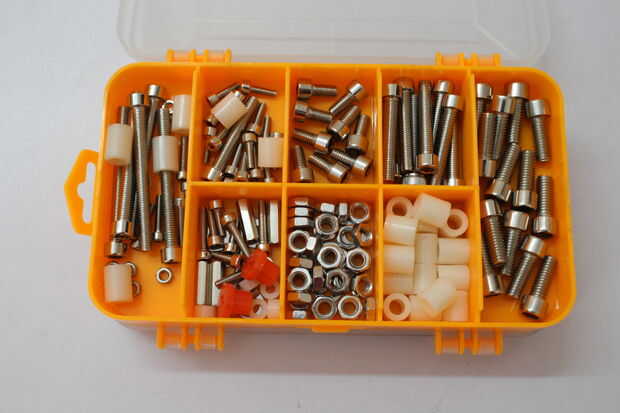 7. piezas caja: 6 pequeños marcos de acrílico, tornillos, correa de distribución, poleas, arandelas y espaciadores