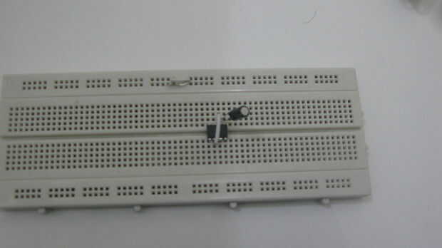 en un protoboard hay es una brecha entre los 2 lados de la fila de fuente de alimentación Asegúrese de conectarlas (mirar la foto)