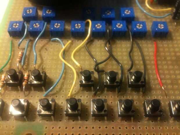 Al agregar el puente, la soldadura a la esquina opuesta de la cual usted había soldado el alambre puente al. Si ha agregado el puente a la izquierda de cada botón, conecte el puente a la derecha de cada botón. Conecte cada botón al pin del su respectivo potenciómetro 1.