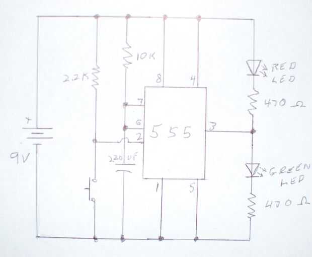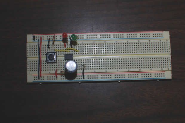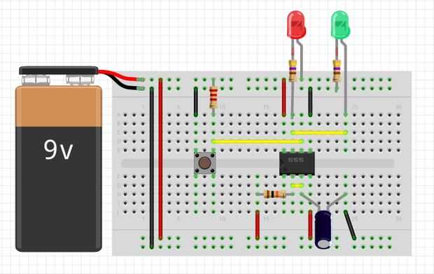 Cuando se presiona el botón pin 2 detecta la corriente por la resistencia de 2,2 K y convierte la salida de alta y el condensador empieza a cargar a través del resistor de 10 K.