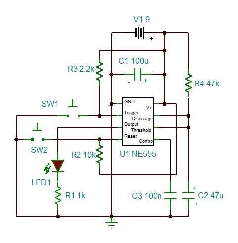 Empuje el SW1 y el LED se ilumina por un corto tiempo y luego se apaga. El tiempo permanece encendida se encuentra multiplicando los valores de R4 y C2 y se expresa en segundos. El tiempo no es exacto, y como cualquier valor es muy grande o muy pequeño, el error aumenta. Un potenciómetro de una magnitud similar a pero en lugar de R4 te dará mayor control sobre el tiempo. Al final, la única manera de saber la hora exacta es realmente la hora con un reloj.
