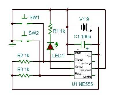 Pulsar SW1 y el LED se enciende. R2 las fuerzas perno gatillo 2 alta hasta que se pulsa el botón, impidiendo que el circuito de activación. Una vez que se presiona SW1, el flip-flop interno se convierte en el pin 3 de salida y espera para la señal del segundo comparador a decir eso Perno umbral 6 ha alcanzado 2/3 del voltaje de la fuente. Pero conectamos pin 6 a tierra, así que nunca viaje, manteniendo el circuito en el comparador y estable indefinidamente. La única manera de detenerlo es prensa SW2, que conecta el pin de reset 4 a la tierra, que hasta ahora ha tenido alta por R3. Esto hace que el flip-flop a volver a su estado original, apagando el LED. El circuito es estable una vez más en este estado, espera que el usuario presiona SW1.