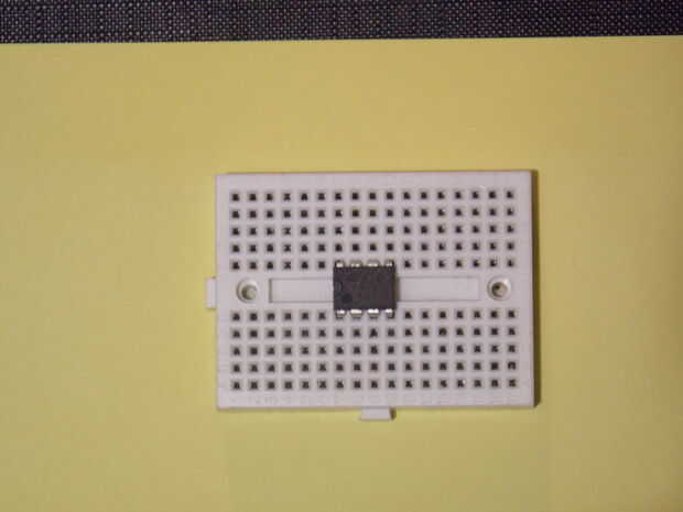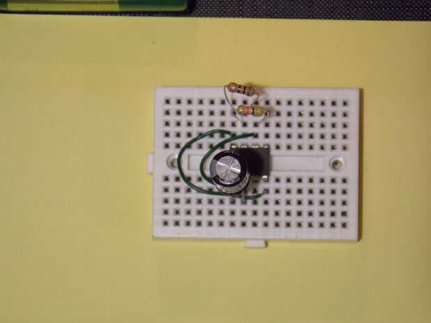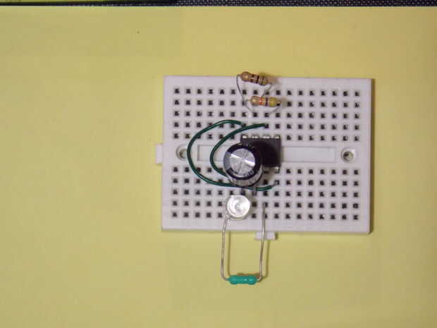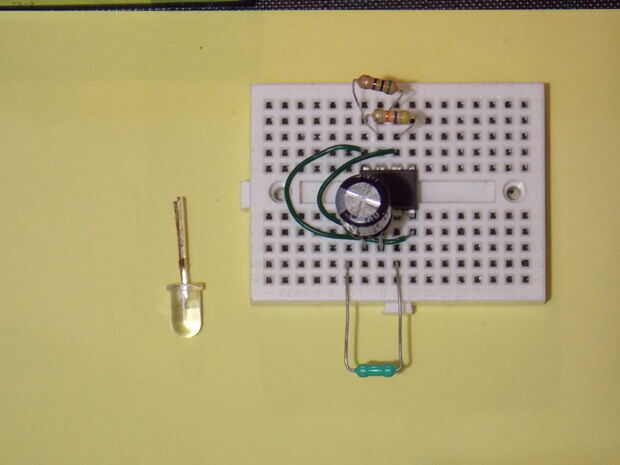 el primer proyecto jamás construido fue una luz que titilaba y apagar. Tomó nueve partes y un par de cables. Agradable y fácil.Con algunas resistencias y condensadores, he configurado básicamente un chip 555 temporizador como oscilador (término fanta