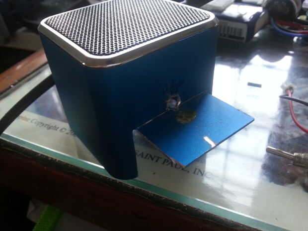 estos altavoces son un combo de esos altavoces de foldup swapmeet que venden para ipods y algunas rescatado de una vieja computadora mac.  soporte de la batería es de la primera versión de mis luces de bicicleta y los cables fueron comprados en el sh
