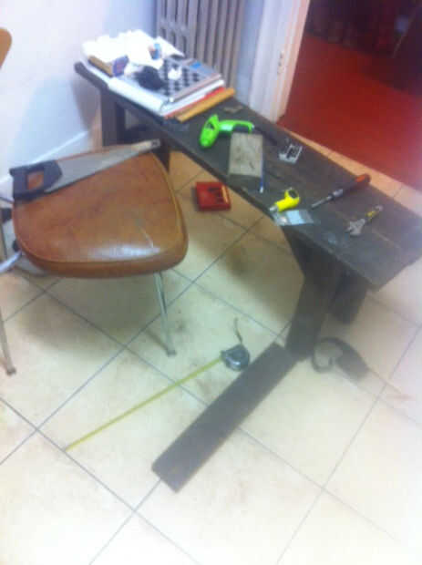 Se necesitan tornillos con tuercas y arandelas, dos 4" L-brackets, un pedazo de madera por lo menos de 4.5" de ancho (longitud no debería ser un problema), dos tornillos de 2" construcción y una muleta de aluminio. Las herramientas incluyen llave / alicates, destornillador, Sierra y taladro (nunca consigue ese taladro $20 de la tienda de comestibles, o te arrepentirás).