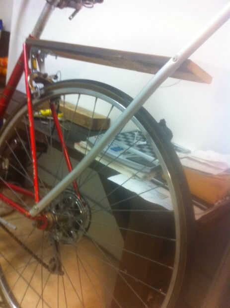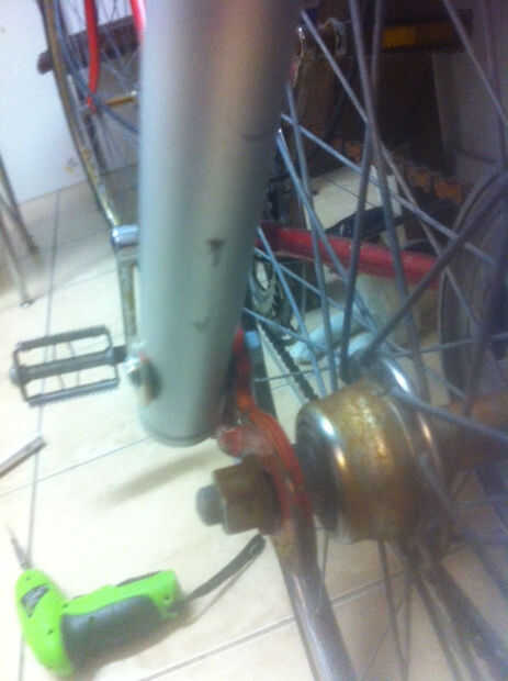 Ahora tome un pedazo de la pipa de aluminio recuperado de la muleta y fije el marco primero, cerca de donde el eje de la rueda trasera adapta a la estructura. Esperemos que tu moto tiene estos agujeros incorporado. uso arandelas, incluso si tienes que ir a la caja de herramientas.