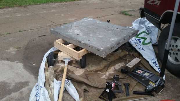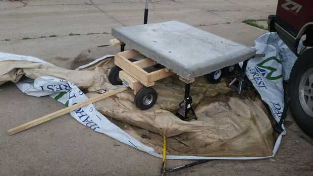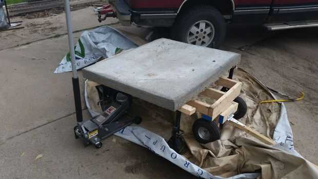 Ahora es la parte... Carro de rodillo debajo de la losa. Jack stands de quitar de un lado. Lo mismo para el otro lado. BAM 700 libras de losa de concreto en mi pequeño carro. ¿Pasará???